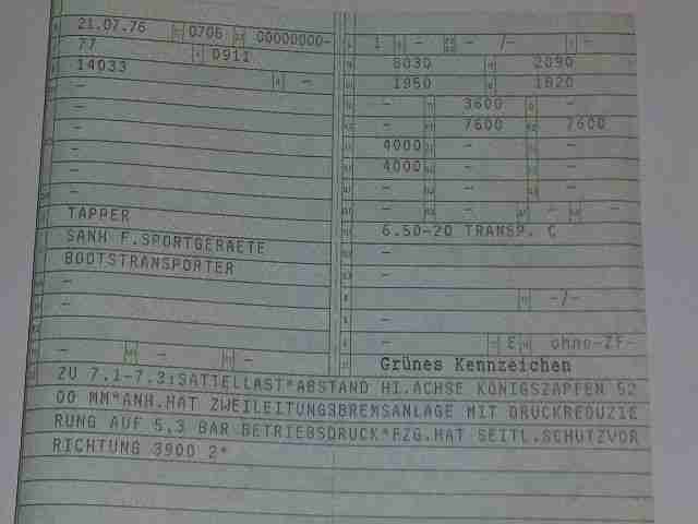 Vorher konnte man damit Boote fahren. Die Stützen für die Boote sind auch noch dabei. Er könnte mit ein paar Handgriffen wieder zum Bootstransporter umgerüstet werden. Der Auflieger ist Baujahr 1976. Hat aber in seinem Leben noch nichts geleistet.Das Fahrzeug hat Trommelbremsen und TÜV bis 04.2015. Er ist 8,00 mtr. lang und 2,20 mtr. breit. Die Nutzlast und das Gesamtgewicht könnt ihr aus dem Fahrzeugschein entnehmen.