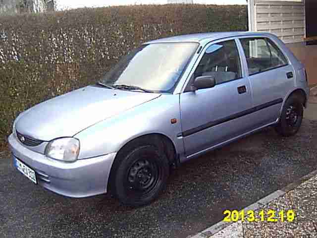 Im Auftrag und Namen meiner Tochter: Ich biete meinen kleinen Daihatsu zum Verkauf an. 989 ccm, 4 Sitzplätze, 41Kw, 56 Ps, grüne Plakette. Er ist sehr sparsam und günstig im Unterhalt. Er hat ein paar Gebrauchspuren, wie Kratzer (siehe Bild). Es wurden viele Sachen erneuert, u.a. neue Reifen vorn, Bremsen neu, Zündkerzen neu, Kupplungsseil neu, Roststellen wurden entfernt und überlackiert. Er hat TÜV bis April 2016. Bei Fragen einfach Mail schreiben. Besichtigung und Probefahrt nach Terminvereinbarung. Keine Gewährleistung, keine Garantie, keine Nachverhandlung, keine Rücknahme.