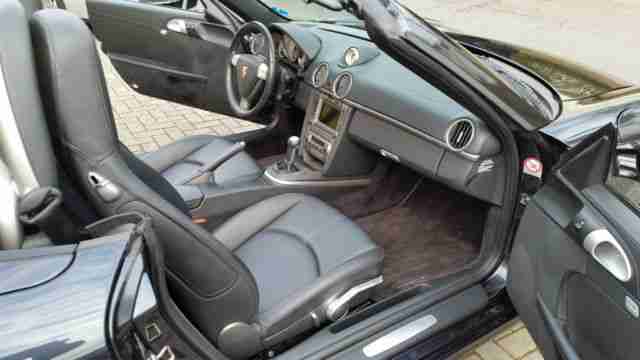 Lenkrad axial verstellbar, Make-up-Spiegel beleuchtet, Sitze: Fahrer- und Beifahrersitz mit elektrischer Lehnenverstellung, Heckspoiler, automatisch ausfahrend, Räderzubehör: Reifen-Reparatursystem, Lenkrad: 3-Speichen-Lenkrad in Leder;; Mittelkonsole: vorn;; Verdeck, Stoff, elektrisch betätigt;; Räderzubehör: Diebstahlsicherung für Räder;; Vorrüstung für Kindersitzbefestigung ISOFIX auf der Beifahrerseite;; Grundausstattung Boxster;; Zifferblätter, Aluminiumfarben;; Getriebe: 6-Gang-Schaltung mit Schaltverkürzung, Außentemperaturanzeige;; Bordcomputer;; Wegfahrsperre;; Fensterheber elektrisch vorn;; Airbag: Porsche Side Impact Protection System (POSIP);; Nebelscheinwerfer;; Interieurteile in Alu-Optik lackiert;; Kopfstützen vorne;;Radio "Porsche CDR 24 NAVIGATION groß 16:9 mit Kartendarstellung in farbe";;