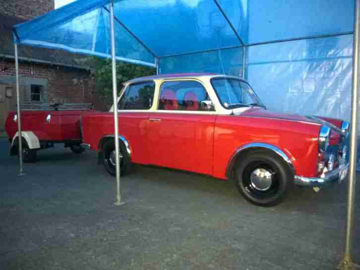 Der Anhänger verdiehnt die Note 1+ und der Trabant eine 2- weil sich ein kleines Rostlöchlein auf der linken Seite befindet. Sonnst gibt es auch nix weiter drann auszusetzen. Als Besonderheit sei zu erwähnen das der Trabbi viele verchromte Teile besitzt. Spiegel,Lüftungsgitter,Grill,Radläufe,Frontschürze,Lampenringe,
