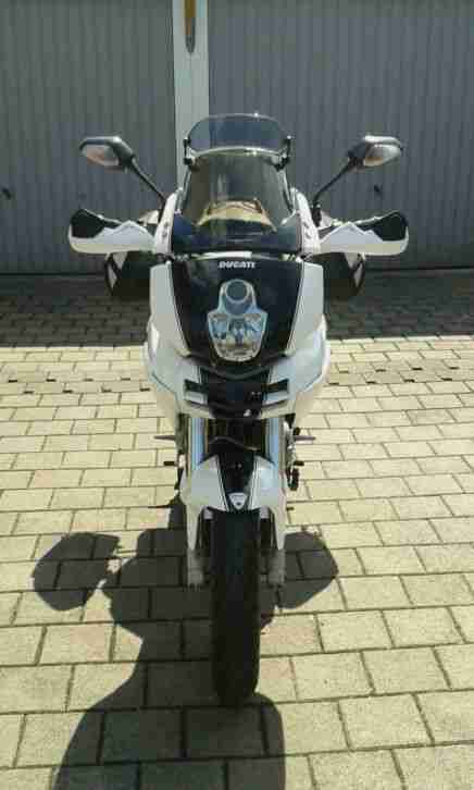 Sonderlack weiß / schwarz getönte Frontscheibe mit Spoilerscheibe 6-fach verstellbare Brems- und Kupplungshebel mit rot eloxiertem Versteller Griffschalen mit Spoiler 12Volt Steckdose Navi Ducati Tankpad Sondersitzbezug schwarz/weiß mit Multistrada Stickerei auf Sozio-sitz Sozio Abdeckung weiß Packtaschen Hepco und Becker Bugspoiler weiß Clobetrotter 90th Design Oilkühler Staufach rechts von Multistrada 1100 Inspektionsdeckel schwarz mit Ducati Emplem Fender hinten Ventildeckel und Zahnriemenabdeckung schwarz lackiert rot eloxierte Schrauben Rücklicht weiß Mini LED-Blinker hinten weiß Spiegelblinker vorne weiß rote ST4s Felgen mit 180er Hinterreifen ( eingetragen! ) Tüv 4/20 Oil und Oilfilter neu Zündkerzen neu Montageständer rot für vorne und hinten