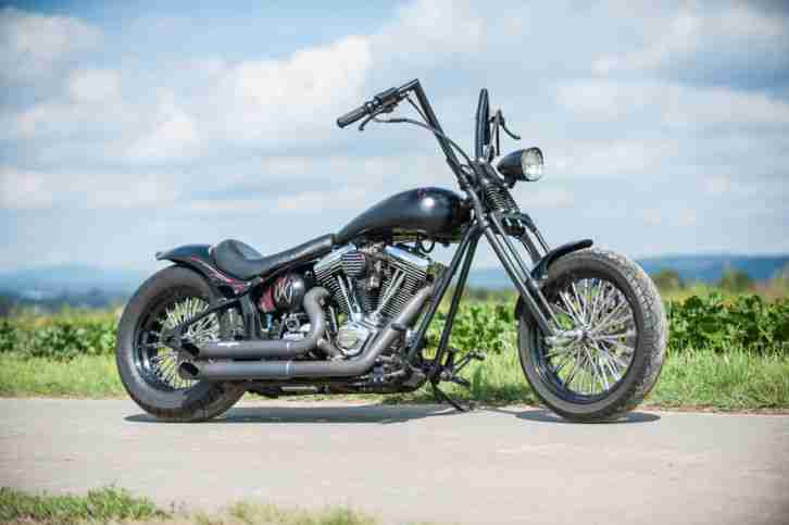 Dyna S Dualfire Zündung, Primär umgebaut auf Belt, Wide Glide Gabel mit gereckter Verstellbrücke, Fehling Lenker mit Risern und Ochsenaugen, Vorverlegte Fußrastenanlage CPO, 38er Dellorto Vergaser mit K&N Luftfilter, kurze Dämpfer 310 mm, gelochte Russel Bremsscheiben mit Stahlflex Bremsleitungen, 2 in 2 Supertrapp Auspuffanlage mit eingetragenen 100 dB also 105 dB legal fahrbar.