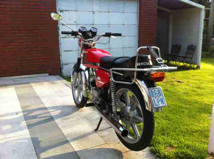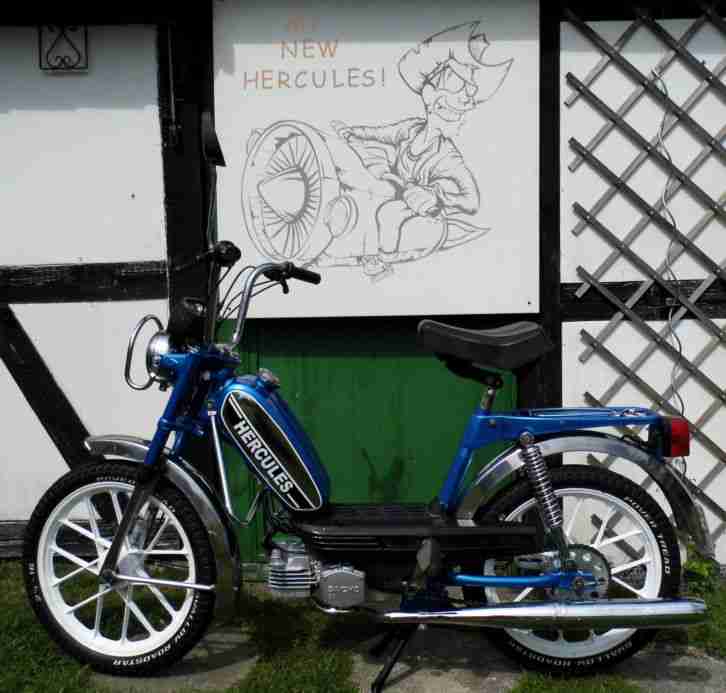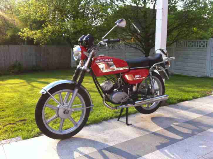 Hercules MK2 - komplett restauriert - sandgestrahlt - neu lackiert (Acryllack Ral 3002, orig. Farbton)- NEU: Radlager; Lenkkopflager; Schwingenbuchsen; verstärkte Ständerlagerung; Bremsstange; Bremsbeläge; Stopplichschalter; alle Glühbirnen; Bowdenzüge; Griffe; Tankdeckel; Benzinhahn; Continental Reifen + Schläuche; Fußrasten + Gummis; Schalthebel- + Kickstartergummi; Luftfilter; Zündkerze + Stecker; Zündkontakt + Kondensator; alle Schrauben (davon mehr als die Hälfte in Edelstahl) + Hutmuttern; Gepäckträgergummi (Denfeld); Spiegel (Bumm); Schnarre; Lenkschloß + Kappe (Neimann); Tachowelle