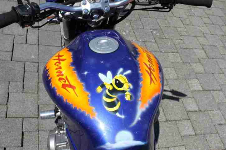 | “Verkaufe sehr gut erhaltene und zuverlässige Honda CB 600 F Hornet.Letztes Jahr im August wurde das Lenkkopflager und die Gabelsimmeringe erneuert, so wie der Tüv gemacht. Seit dieser Zeit ist sie auf Grund von Zeitmangel kaum noch bewegt worden. Im April 2015 wurde auch noch die Batterie erneuert. Nun einige Fakten: Superbike-Lenker, schwarzes LED-Rücklicht, Spiegel, Sportfahrwerk v + h, Shark-Doppelauspuffanlage, Airbrush-Lackierung, lackierte u. polierte OrginalfelgenMit dazu gibt es eine zweite Sitzbank (niedrige Version), original Auspuff, sowie Kleinteile.Die Maschine ist unfallfrei sowie umfallfrei!!!” |