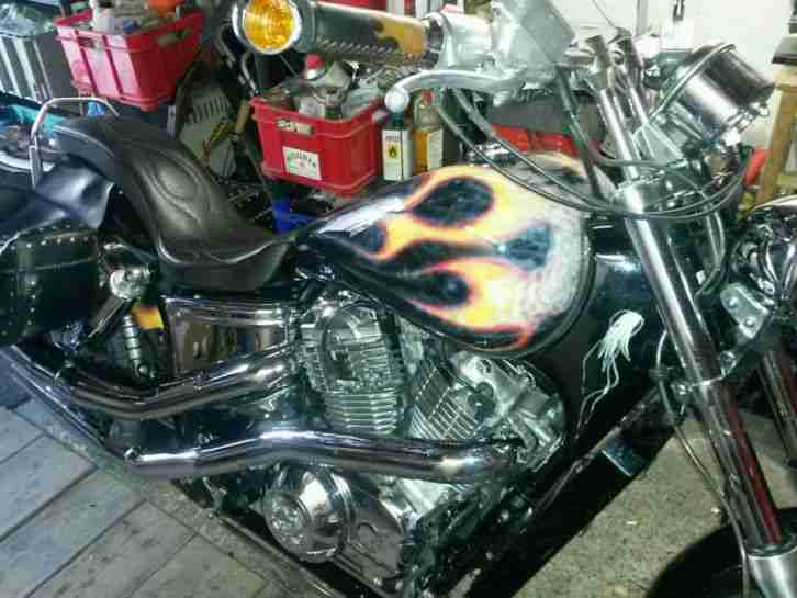Verkaufe hier eine VT1100C SC23 Amerikanische ausführungFlammenlackierungRiser200mm mit Lenkerumbau(Eingetragen)Stahlflexltg(ABE)Sitzbank (Eingetragen)Vorverlegte Fussrastenanlage (Eingetragen)LenkerendenblinkerReifen 70% Vorne und hintenÖlwechsel neuBremsflüssigkeit neu Tüv neu 09/2017 Da Bike Amerikikanische ausführung ist hat sie natürlich den besseren Sound;-)als die Europäische Version Jetzt noch :Kleine Delle im Tank fällt aber kaum auf.Chrohmplatzer amLenker (nicht so wild )am Kupplungsgehäuse ist aber nur die Abdeckung kann man austauschen.Sonst ist der Chrom im Bestzustand.