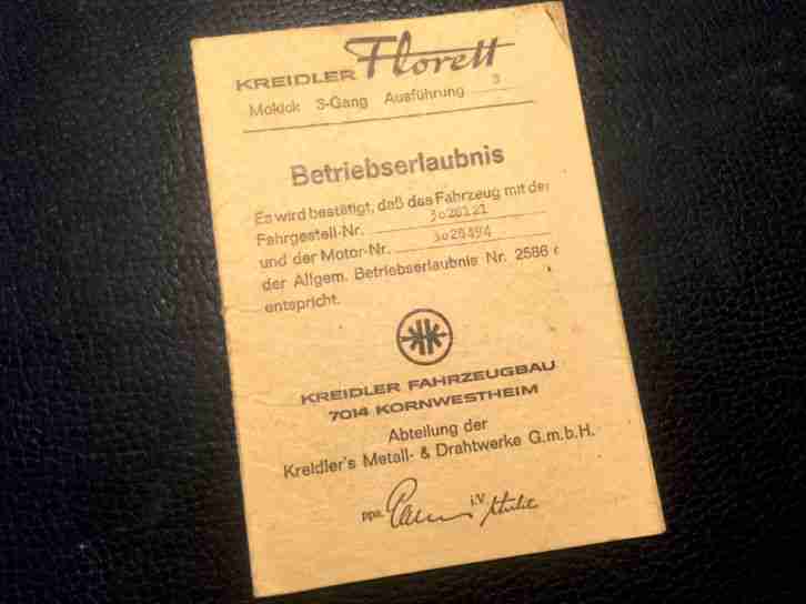 KREIDLER FLORETT MOKICK 3 Gang K54 O M 1966 BETRIEBSERLAUBNIS zum Restaurieren
