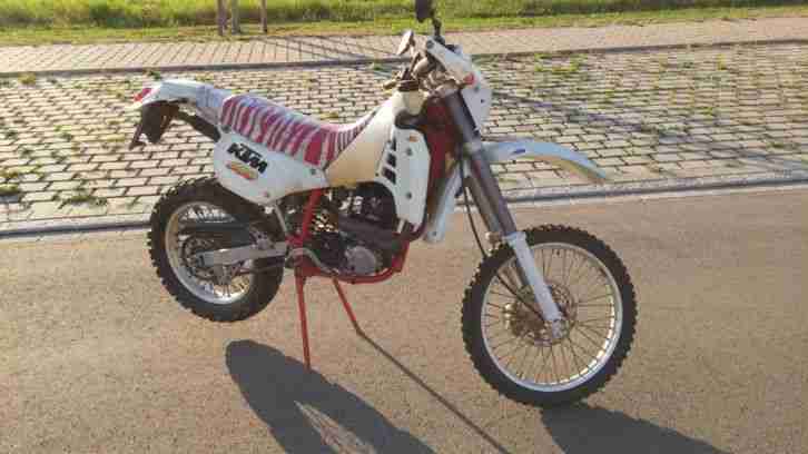 Angeboten wird eine KTM 600 LC4 Supercompetition, die als Wettbewerbsmaschine ohne Batterie, Ausgleichswelle und Soziusfussrasten unterwegs ist. Das Motorrad war aber normal Strassen zugelassen. Angeboten wird sie als Bastlerobjekt, da der Motor zwar prima anspringt und läuft, ich aber keine Zeit mehr haben die Kupplung einzustellen (als Motor läuft aber Probefahrt kann nicht gemacht werden). Motorrad hatte bis letztes Jahr im Juni TÜV, da ich es damls gerade überholt habe, habe ich den TÜV nicht mehr machen lassen.