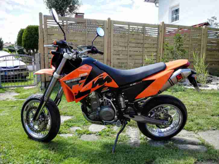 Biete hier meine KTM LC4 640 Supermoto mit einem Kilometerstand von 23.305km an. Die Maschine ist technisch einwandfrei. Ich habe das Motorrad aus erster Hand gekauft und verkaufe es, weil ich auf die 990 SM umgestiegen bin. Das Motorrad wurde von mir immer erst warmgefahren. Die Maschine wurde im Winter nicht gefahren und stand immer in einer Garage. Die Wartungsarbeiten wurden von mir immer gewissenhaft durchgeführt, es wurde nur das Motoröl Motul 7100 10W60 gefahren. Das Motorrad hat ein Ölthermometer, eine Akrapovic Komplettanlage mit Titankrümmer (im Wert von ca. 1.300€) und einen Mikuni Flachschiebevergaser von ABP Racing, dadurch hat sie ca. 60 PS. Beim Fahrzeug dabei sind noch zusätzlich eine aufgepolsterte Sitzbank, die originale Auspuffanlage, sowie der originale Vergaser und das SLS System.