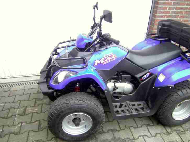 Quad Kymco MXU 50 bj. 08 ,4300km , 50ccm , 3kw mit Strassenzulassung für 2 Person ab 16j fahrbar mit kleinen Kennzeichen. Verschleißteile alle ok., alle 4 Reifen + Batterie sind neuwertig , Halbautomatik , Schaltung: Vorwärts + Rückwärtsgang sowie Neutral. Elkt. Tankanzeige , Tank Schloss , E-starter + Kick , Digitaltacho , Kettenantrieb , Stahlfelx-Bremsleistung , Klarglasscheinwerfer , u.s.w. 160kg Leergewicht ,1,80 lang inkl. 1 wasserdichten Alukiste für vorn , Größe wie Yamaha Raptor YFM 350 Lieferung im Umkreis von ca 30km evtl. möglich.