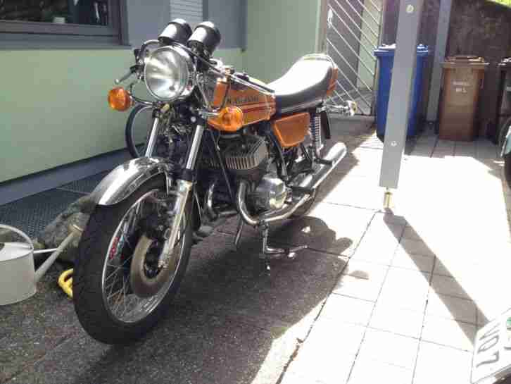 Die hier angebotene Kawasaki H2, ist eine H2E von 1973. EZ März 1973. 3 Zylinder Zweitakter, 750ccm, 71PS. Die H2 stand über vierzig Jahre unberührt und abgemeldet in einer Garage. Sie wurde nun zerlegt, alle Schmierstoffe wurden gewechselt, viele Dichtungen, Gabelsimmerringe, Bremszylinder/Armatur und Sitzbank wurden getauscht (nur neue Originalteile! - Sitzbank mit Stahlboden und nicht Kunststoffboden, wie bei billigen Replikasitzbänken!) Die Vergaser wurden durch Vergaserüberholsätze restauriert, sind aber noch nicht eingestellt. Alles original, selbst die Lackierung! Wenige kleine Beulen oder Kratzer. Auspuffkrümmer sind leicht verbeult und die Auspuffenden angeschrammt. Lt. Vorbesitzer unfallfrei. Schramnen und kleine Dallen entstanden in der Garage. Blinker müssen noch angeschlossen werden Zündung und Vergaser müssen noch eingestellt werden und dann ist sie fertig. Weitere Ersatzteile sind vorhanden und werden mitgegeben. Traumhafter Gesamtzustand, siehe Fotos. Da die H2 noch nicht ganz fertig ist, verkaufe ich sie als defekt. Es sind nur noch Einstellungsarbeiten und das Anschliessen der Blinker zu machen. Die günstigste H2 bei mobile.de liegt bei über € 13"000,--! Privatverkauf unter Ausschluss jeglicher Gewährleistungen und Garantien.