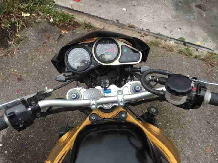 Ich habe einen Superbikelenker mit Stahflexleitungen vorne und nach unten gehende Highsider Spiegel verbaut ( EU Zulassung) dieser (Lenker und Bremsschläuche) sind auch eingetragen! Sportauspuff mit ABE ist auch verbaut! Kilometerstand laut Tacho und GTÜ Papieren 26925 km.