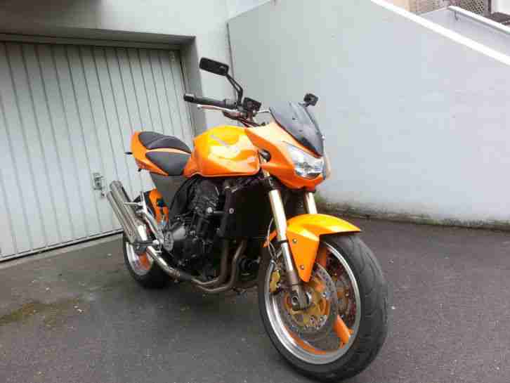 Die Maschine hat eine Leistungssteigerung auf ca 132PS die auch eingetragen ist. Im Schein sind noch Zahlreiche Eintragungen gemacht von denen allerdings nicht mehr alle vorhanden sind. Der Vorbesitzer ist mal bei nasser Fahrbahn Innerorts leicht links weggerutscht aber es ist auser Kratzern am Motordeckel kaum was zu sehen.Die komplette orangene Verkleidung inkl. Tank stammt von meiner ersten Z und wurde Teilweise nachlackiert. Ich hatte das Motorrad auch schon mit seiner eigenen Verkleidung angeboten diese wurde vom Vorbesitzer braun lackiert was aber Geschmackssache ist wie mir manche nahe legten und deshalb biete ich sie nun mal in orange an.