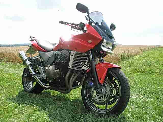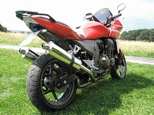Eine wie keine! Biete meine einzigartige Lady in red, eine Kawasaki Z 750 S in Pearl Magma Red an. Sie wurde in Sound und Optik verfeinert. Deshalb bekam sie einen seltenen EXAN Sportdoppelendtopf, eine MRA Tourenscheibe, ein Motorradnavi mit Aktivhalterung, ein SW Motech Topcaseträger, Daytona Heizgriffe, einen elektrischen Kettenöler, Bagster Tankhaube in Motorradfarbe, edelstahl Kühlergrill, edestahl Kettenschützer, verchromte Bremsbehälterabdeckung vorne mit Z750 Logo, Alu Bremsbehälterdeckel hinten, edelstahl Nummernschildhalterung mit Z Logo und Nummernschildbeleuchtung, Öltemperaturdirektmesser, einbau LED Blinker vorne, LED Blinker hinten. Alle Blinker sind über ein spezielles Blinkrelais angesteuert. Alle elektrischen Anbauteile werden über ein, über die Zündung geschaltetes, Arbeitsstromrelais geschaltet. Vor kurzem hat die Z eine neue Gel Batterie, einen K&N Luftfilter und neues Öl samt Ölfilter erhalten. Eine Hinterradabdeckung gibt es auch noch mit dabei. Die tollen und schönen Umbauten haben mich, rein an Materialkosten, 1700 Euro gekostet. Die Z ist in einem technischen und auch optischen guten Zustand. Die vorhandenen Orginalteile gibt es gratis dabei. Auf Wunsch gibt es auch noch einen Motorradhelm in Größe S mit dabei.