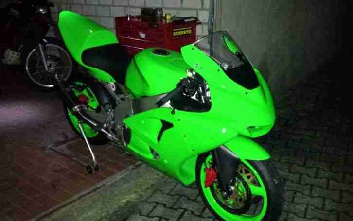Verkaufe hier ein Winterprojekt.Kawasaki ZZR 600 D 72 KW 232 km/h EZ.14.03.1991 Kilometerstand unbekannt.Motor dreht will mit Startpilot auch kommen aber nicht so richtig eher mit Fehlzündung Schläuche zum Vergaser sind nicht montiert es fehlen glaub ich 1-2 Unterdruckschläuche deshalb verkaufe ich sie ausschließlich als defekt.Abgemeldet 08.03.2010 daher eingestaubt aber guter Zustand.Soziussitzkissen ist nicht mehr aufzufinden.Gibt es aber vom Hersteller Performencebestimmt nachzukaufen ,ansonsten beim Sattler eins machen lassen.Batterie fehlt war über die Jahre defekt.Mehr angaben kann ich dazu nicht machen habe das Bike eingetauscht und verkaufe es aus Platzgründen und gesundheitlichen Gründen.Ist aber ein schönes Einzelstück.Hier ein paar Angaben zu den montierten Teilen:Big-BikeDoppelscheinwerfer,Stahlflexbremsleitungen,Superbikelenker,Gabelbrücke,Kellermannblinker,hinten Miniblinker,Bugspoiler,Höckersitzbank Performence,MGM Kotflügel,Rücklicht weiß,Nummernschildhalter,Reifen vorn120er hinten 170 er Profil gut aber halt älter.Teile sind alle eingetragen.Fahrzeug hat Brief Schein und ein Schlüssel.....Wird ausschließlich als Bastlerfahrzeug oder zum ausschlachten als Teileträger verkauft keine Garantie oder Rücknahme.Spaßbieter hören von meinem Anwalt und werden mit 30% vom Gebotspreis belangt................Versand möglich wenn Käufer Spedition beauftragt gegen Vorkasse.