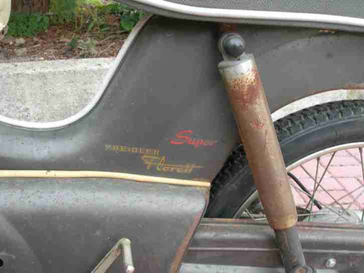 Verkaufe eine Kreidler Florett Super 4 Baujahr 1963 die Ich selber aufbauen wollte! vor 20 Jahren steht seit dem trocken im GaragenkellerHabe leider keine Zeit mehr dafür (Beruf und Familie ) . Das Moped läuft , bin schon eine Runde gefahren (sehr schnell!! ca 100 km/h)aber Orginalzustand bis auf dem rechten Seitendeckel teile sind alle da nur der vordere Chrom bügel nicht .es ist auch noch ein Beinschild vorhanden Es könnte mit ein paar Ersatzteilen Einsatzbereit gemacht werden sollte aber Restauriert werden!ABE ist leider nicht dabei , die Ausstellung einer neuen ist aber für die Kreidler problemlos und günstig.Verkaufe es als Bastlerobjeckt.Sehen sie sich die Bilder genau an bitte Für Lieferung hätte ich auch eine gute Adresse kostet ca 70 € beim kauf kann ich ihnen ja die Nummer geben oder Selbstabholer!viel Spannung beim Bieten,...wenn noch fragen ich beantworte sie gerne