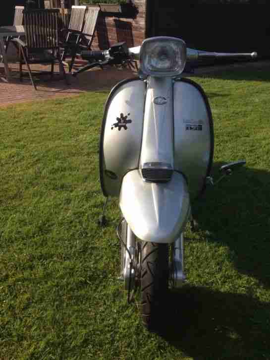 Biete hier meine Lambretta GP 125. Seid Restauration ca. 250km gelaufen ( wird noch gefahren). Der Motor wurde ebenfalls restauriert. Eingetragenes Baujahr 1970, Eingetragener Hersteller: Innocenti, 125ccm eingetragen ohne Blinker. Scheibenbremse, ScootRS mit LTH Dämpfer Dämpfer mit BSAU, A&F Clubman Auspuff gibts dazu ( hiermit war sie beim TÜV), 175ccm Zylinder, Auspuff und Zylinder sind nicht eingetragen. Eingetragene Höchstgeschwindigkeit 90Km/h. Kann also bereits mit 16 Jahren gefahren werden. Läuft super und springt sofort an. Wurde bei Purdys in Southampten restauriert. Englische und Deutsche Papiere. Tüv bis 08/2016. Hinterrad und Ersatzrad Edelstahlfelgen schlauchlos.Vorne normale Felge wegen wegen der Scheibenbremse.