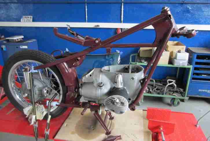 Sie bieten hier auf eine MZ BK 350 zum fertigstellen bzw. zusammenbauen. Nach der Beschreibung folgen noch sehr viele Bilder...Die Maschine ist Baujahr 1957 und hat schon die neuen Fahrzeugpapiere (Zulassungsbescheinigung 1 und 2), die originale Betriebsanleitung ist auch mit dabei (siehe Bilder).Das Motorrad wurde komplett zerlegt und folgende Arbeiten durchgeführt:-Blechteile und Rahmen gestrahlt, ausgebeult, verzinnt und in Maronenrot lackiert (Preis: 800,-)-Motor neu gelagert (Teilepreise Lager 120,-)-Alle Wellendichtringe ( Motor/Getriebe/Hinterachsgetriebe) erneuert-Felgen bei BÖHM Rad neu eingespeicht (Edelstahlspeichen), neue Felgenringe und neue Radlager (Preis:800,-)-neue Reifen Heidenau, Schläuche und Felgenbänder (Preis: 140,-)-Achsen in einer Dreherei aus Edelstahl neu anfertigen lassen-Bremsgestänge für hinten ebenfalls neu aus Edelstahl-Lenkkopflager neu-Radnabenabdeckungen aus Aluminium neu (Preis: 60,-)Ansonsten sind viele Teile doppelt oder bereits neu mit dabei, z.B. Kabelbaum, Lampenring, Bowdenzüge, Sattelfeder, Hauptständerfedern, Spiegel, Lenker, überarbeitete Kardanwelle mit Gelenken und Gummies usw...am besten die Bilder anschauen... Es steckt wirklich schon sehr viel Geld in den div. Arbeiten und Teilen.Es fehlen noch die zwei Schalldämpfer und sicherlich auch div. Kleinteile die bei einer Restaurierung so anfallen können, die Maschine ist ja auch zum fertigstellen gedacht.Die vorderen Federbeine müssten ebenso noch überholt werden wie auch div. Kleinteile (z.B. Teile verchromen, Schrauben, Sturzbügel lackieren/verchromen usw...)Ich wünsche vor Gebotsabgabe eine Besichtigung, um Missverständnisse auszuschließen Da es sich um einen Privatverkauf handelt, gebe ich weder Garantie noch Gewährleistung. Der Artikel ist vom Umtausch ausgeschlossen. Ebenso muss das Motorrad bei der Abholung bar bezahlt werden. Die Motorradhebebühne gehört nicht mit zur Auktion