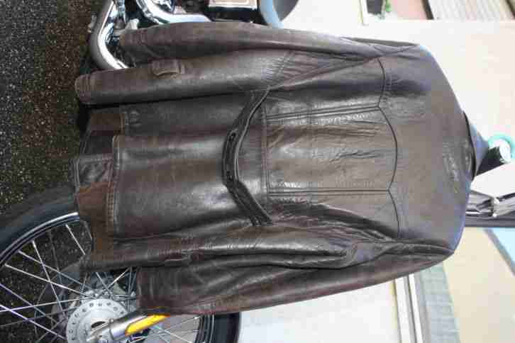 Motorradjacke aus Leder 1951Die Jacke ist von meinem Opa sie ist aus Braunem Leder innen Wildleder er hat sie 1951 gekauft die größe ist 52 hat eine innen Tasche an den Ärmel sind unten Gummizüge sie ist in einem gutem Zustand ohne Risse.