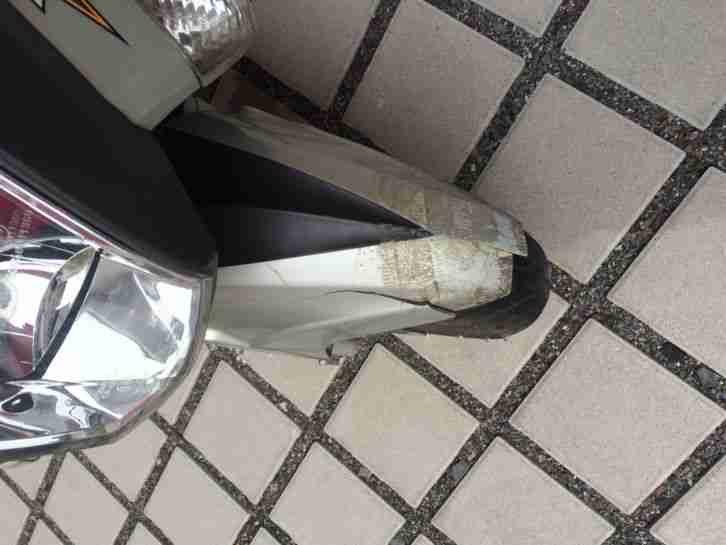4-Takt-Motor, 12-Zoll-Reifen, Scheibenbremse vorn, Leergewicht 85 kg, Abgasnorm EURO 3, zwei Jet-Helme, leichte Lackschäden durch Spanngurte, Einfassung des rechten Spiegels beschädigt, Spiegel aber voll funktionsfähig