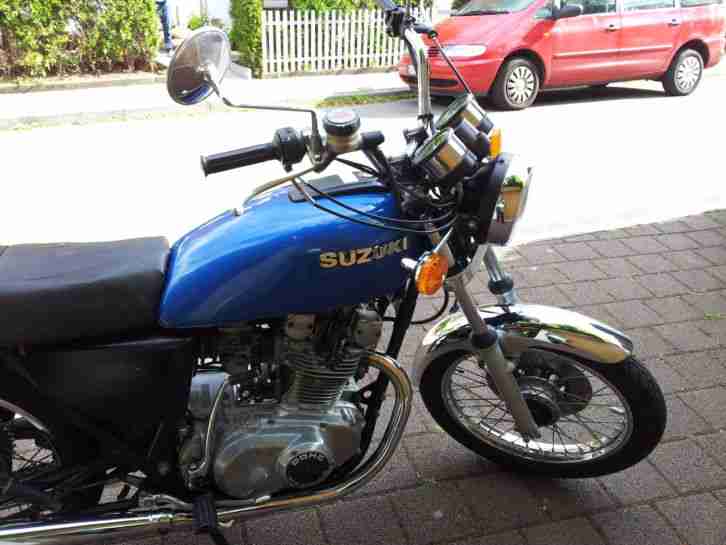 Sehr seltene blaue Suzuki GS 400 mit Speichenrädern und 34 PS Nockenwellen. Seit 32 Jahren in meinem Besitz. Sie wurde bis Anfang August noch gelegentlich gefahren und jetzt abgemeldet (Folgefahrzeug). Das Bike hat einen geringfügig höheren Suzuki Lenker eingetragen. Sehr bequeme Sitzposition.