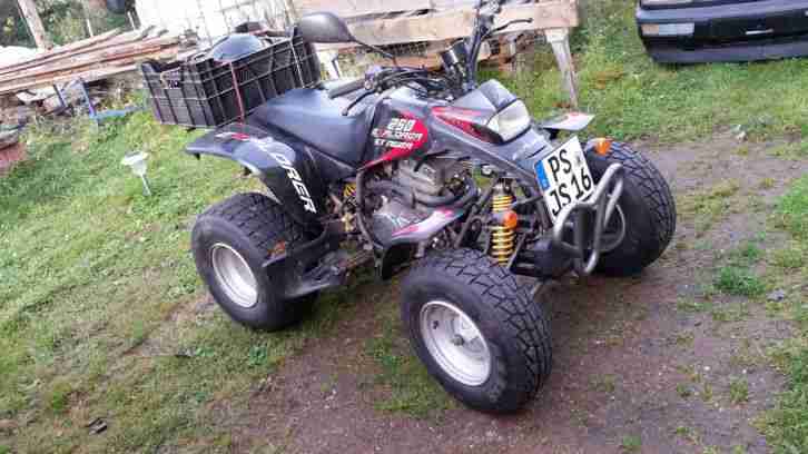 Versteigere hier mein 250er Quad SMC Stringer 19 ps es hat erst dieses Jahr neu Tüv bekommen ohne Mängel.Es fährt auch super und funktioniert auch alles wie es soll die Höhstgeschwindingkeit ist 120 was auch voll ausreicht.