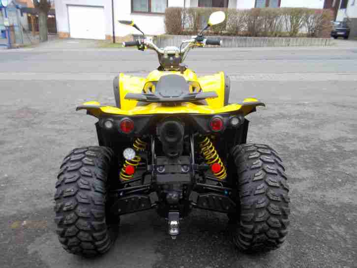 Top gepflegtes Quad TGB Target 500 IRS LOF, Allrad. 1 Hand. EZ. 05.2015, nur 2200 km. 461 ccm, dank LOF 33 PS. Zuschaltbarer Allradantrieb. Anhängerkupplung. Noch 10 Monate Garantie bei allen deutschen Vertragshändlern! Viel Sonderausstattung! Das Quad ist riesig, kommt auf den Bildern nicht so rüber ist durch die 14 Zoll Felgen wirklich sehr sehr beeindruckend. Die TGB ist in einer Fachwerkstatt Rapsgelb(Ral 1021) lackiert worden. Verkleidung vorne und Seiten in Carbon. Es ist in absoluten Top Zustand, keinerlei Beschädigungen, Kratzer oder sonstiges! Wie neu! 2 Inspektion ist gemacht. Top eingefahren, nur Schönwetter Fahrzeug, kein Gelände, Garagenfahrzeug. Sonderausstattung: Spiegel, Federn, Bremssättel in Quadfarbe. LED Blinker vorne und hinten, LED Rückfahrlicht, LED Rück/Bremslicht, Drehgasgriff für entspanntes fahren(in Deutschland zugelassen), Riesige 14 Zoll Felgen ohne Beschädigungen mit den besten Mischreifen(Fahrleistung ca. 1000 km) für Gelände und Strasse die es zu kaufen gibt(Reifen Stückpreis 150€, Räder komplett 1000€). Die Räder haben eine Ausnahmegenehmigung von der DEKRA und müssen nur noch in den Fahrzeugschein eingetragen werden! Alle LEDs haben ein E-Prüfzeichen und sind somit zugelassen und eintragungsfrei. Neupreis mit allen Sonderzübehör 8200€ Die TGB ist bei Verkauf nicht zugelassen, kann aber natürlich Probe gefahren werden.