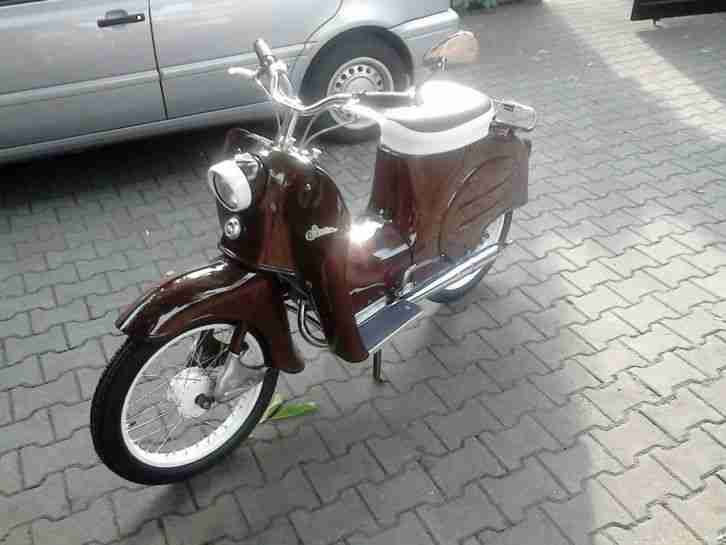 Fahrzeug wurde komplett gestrahlt die Blechteile wurden neu lackiert in der Ral Farbe Schokoladenbraun und Cremweiß der Rahmen wurde gestrahlt und in Schwarz Pulverbeschichtet. Die Felgen und Naben wurden auch gestrahlt und Pulverbeschichtet. Edelstahlspeichen wurden montiert. Der Sitz wurde beim Sattler neu angefertigt (Einzelstück). Elektrik wurde überholt neue Zündanlage (Unterbrecher). Alle Gummiteile wurden überarbeitet oder ersetzt alle Bowdenzüge sind neu. Alle Gummilager in den Schwingen und die hinteren Stoßdämpfer wurden ersetzt. Der Tank wurde innen versiegelt. 2 Gang Handschaltung. Motor wurde überholt neue Lager und Dichtungen neuer Kolben Zylinder wurde außen neu beschichtet. Kupplung ist neu sowie Kette und Ritzel. Neue Reifen. Oder Preisvorschlag!!!
