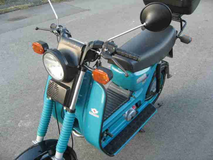 Versteigere einen Simsonroller SR/1 Star Classic 50. Der Roller ist in einem makellosen Zustand, hat 1500 Km gelaufen. Stand über Jahre in einer warmen Wohnung und wurde von einem Rentner gefahren. Es gibt kein Rost. Sogar hinter der Verkleidung vorn ist nicht einmal Staub. Alle Funktionen sind ok. Der Roller ist noch bis März angemeldet. Der Lack ist ohne Kratzer ( Pulverbeschichtung orginal ). Neuteile : Batterie, Spiegel und Benzinhahn. Reifen, Bremsen usw sind bei der Kilometerleistung natürlich neuwertig. Topcase und Anhängerkupplung sind montiert. Der Roller springt sofort an, läuft gut und lässt sich einwandfrei schalten. Er hat eine elektronische Zündung ( kein Kontakt ) und einen Bing Vergaser vom Werk verbaut.Der Roller kann besichtigt und probegefahren werden. Papiere, Serviceheft, Betriebsanleitung und Schlüssel natürlich vorhanden. Es gibt keinen Versand ! Bei einer kürzeren Strecke kann ich mit meinem Hänger ( gegen Benzingeld ) behilflich sein. Bei Fragen stehe ich gern zur Verfügung.
