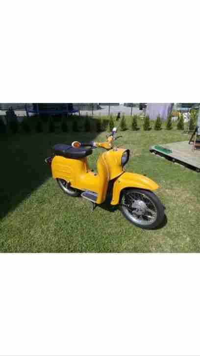 Sehr schöne, mit viel Zeitaufwand und Liebe, neu aufgebaute bzw. restaurierte Schwalbe KR 51/1 mit Papieren an Liebhaber zu verkaufen. Sehr viele Neuteile und restaurierte Originalteile. Die Schwalbe wurde vollkommen demontiert, entlackt, grundiert, lackiert und aufgebaut. Vergaser, Zündung, Kupplung und Bremsen wurden neu eingestellt. Der Motor wurde regeneriert, neue Kickstarterwelle mit Halbmond-Zahnkranz, Zylinder und Kolben neu bzw. regeneriert, Satz VA Schrauben, Unterbrecher und Kondensator neu, Bowdenzüge neu, Tacho neu, Satz Blinker neu, Scheinwerfer neu, Auspuff neu, Rücklichtschale neu, zwei Satz verchromte Speichen neu, Bereifung neu, Kabel erneuert bzw. neu verlegt, Leuchtmittel ( Birnen ) neu, Gummis neu, und viele restaurierte Originalteile. Die Schwalbe springt sofort an. Die Bilder sprechen für sich.