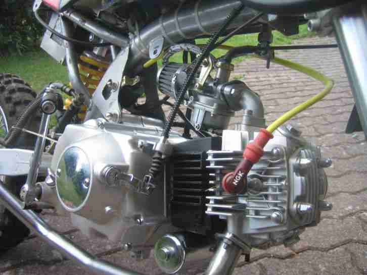 Aus Zeitmangel muss ich mich leider von meinem fast fertig gebauten Skyteam Eigenbau - Crosser trennen.Es fehlt eigentlich nur noch die Pedalerie und damit verbunden der Anschluss der hinteren Bremse und eine Auspuffhalterung.Der Motor ist nagelneu, hat ca. 10 PS und 110 ccm und 4 Gänge.Verbaut wurde ein neuer Superbikelenker sowie eine Sitzbank einer R1.Der Auspuff hat einen absoluten Mördersound.