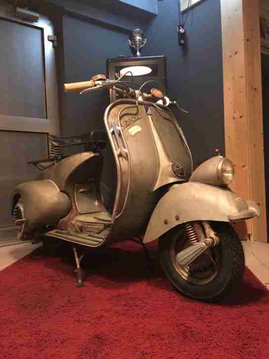 Dieser Roller wurde im Jahre 1962 am 08. Oktober erstmals zugelassen. Es handelt sich hier um eine originale Augsburg Vespa mit Denfeldsitzbank, VDO-Tacho, Schwanenhalsrücklicht, 10 Zoll Räder und Batteriezündung. Der Boden ist ohne Durchrostung. Der Kfz-Brief ist vorhanden, die Vespa ist seit 1986 stillgelegt, ist aber immer trocken gestanden, der Motor lief vor ca. 3 Jahren letztmalig, wurde seitdem regelmäßig, das heisst mindestens 2x pro Jahr durchgestartet allerdings ohne Batterie welche defekt war und sich nicht mehr aufladen ließ. Schlüssel für Lenkradschloss und Seitenbackenstaufach sind vorhanden. Bremsen, Kupplung und sonstiges funktioniert. Der Tank ist immer in Ordnung. Nur der Kraftstoff ist schon alt, der Ansaugschlauch zwischen Luftfilter und Vergaser fehlt, ebenso der Zündschlüssel am Lenkkopf. Die Vespa wird als Restaurationsobjekt und Teileträger auf Grund des Alters von 54 Jahren verkauft. Dies ist ein Privatverkauf ohne Garantie / Gewährleistung. Die Versteigerung ist nach § 156 BGB. Jeder Bieter erkennt diese Klausel mit Gebotsabgabe an. Rückgabe ist ausgeschlossen.