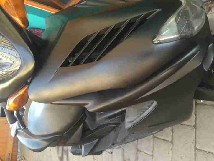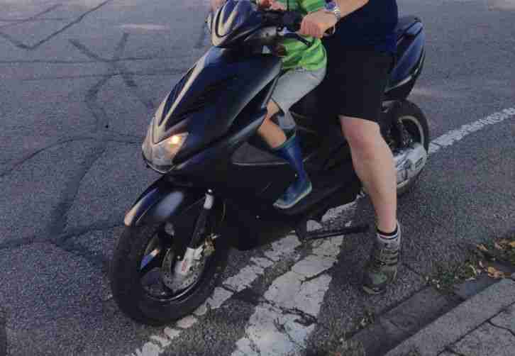Schnell, laut und mattschwarz. Sehr schöner und gepflegter Yamaha Aerox. Aufgrund der Geschwindigkeit vertraglich nur als Bastlerfahrzeug zu verkaufen. Würde mit dem passenden 70er Auspuff noch besser laufen...Fährt mit Mischung. E-Starter nicht angeschlossen. Tachoanzeige funktioniert nicht. Neuer Zylinder, Wasserpumpe, Kickstartertechnik und weitere Kleinteile neu. Papiere vorhanden. Nur gegen Abholung innerhalb einer Woche.