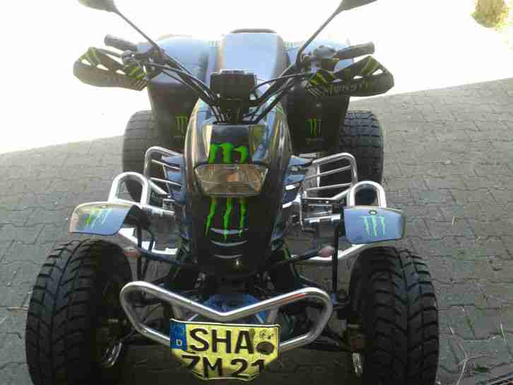 Ich muss mich leider von meinem Quad trennen weil wir Nachwuchs bekommen . Es ist ein neuer Sport Auspuff drauf Kellermann LED Blinker neue Spiegel ein neuer Tacho mit Drehzahl Messer muss aber noch angeschlossen werden . Preis 5500 VHB . Bei Fragen bitte anrufen oder schreiben 0176/61702841 das Quad hat ein Austausch Motor drin und ist 9 tausend km gelaufen es ist Matt schwarz lackiert und Pulver beschichtet . Wenn gebraucht wird hab ich noch einen Oberkörper Panzer in XL und ein Helm