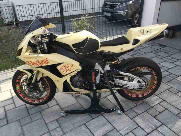 Öhlins federbein hinten, umgebaute Gabel bin Pepetuning, komplette Akrapovic Titan Auspuffanlage, Racing Scheibe, dynojet powercommander, dynojet autotune, dynojet schaltautomat, antihopping Kupplung, Gilles Fußrastenanlage, Breaking Bremsscheiben, Stahlflex Bremsschläuche, qrc Beläge, Sturzpads, Carbon Motor Schutz, Pirelli Sliks (funktionieren noch einige turns)