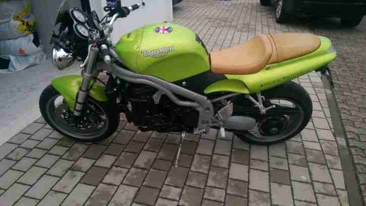 Triumph Speed Tripple, sehr gepflegter Zustand mit vielen Extras, Lenker, Auspuff, Fußrastenanlage, Stahlflexleitungen, Blinker, alles eingetragen. 2002 wurde ein neuer Motor eingebaut mit größerer Leistung, vom TÜV eingetragen